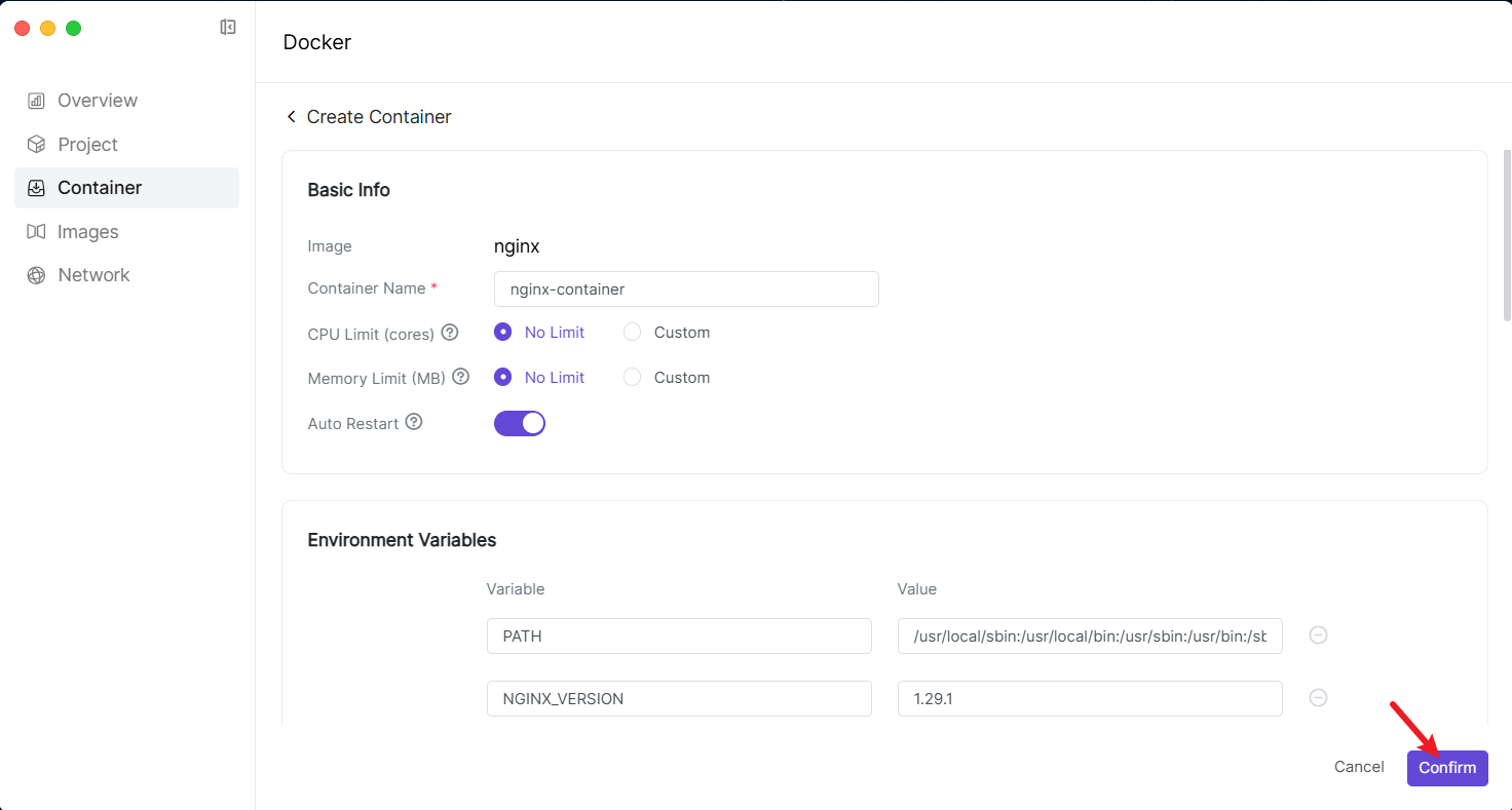 - Auto Restart: It is recommended to enable this feature to ensure the container automatically recovers and runs after unexpected stops.