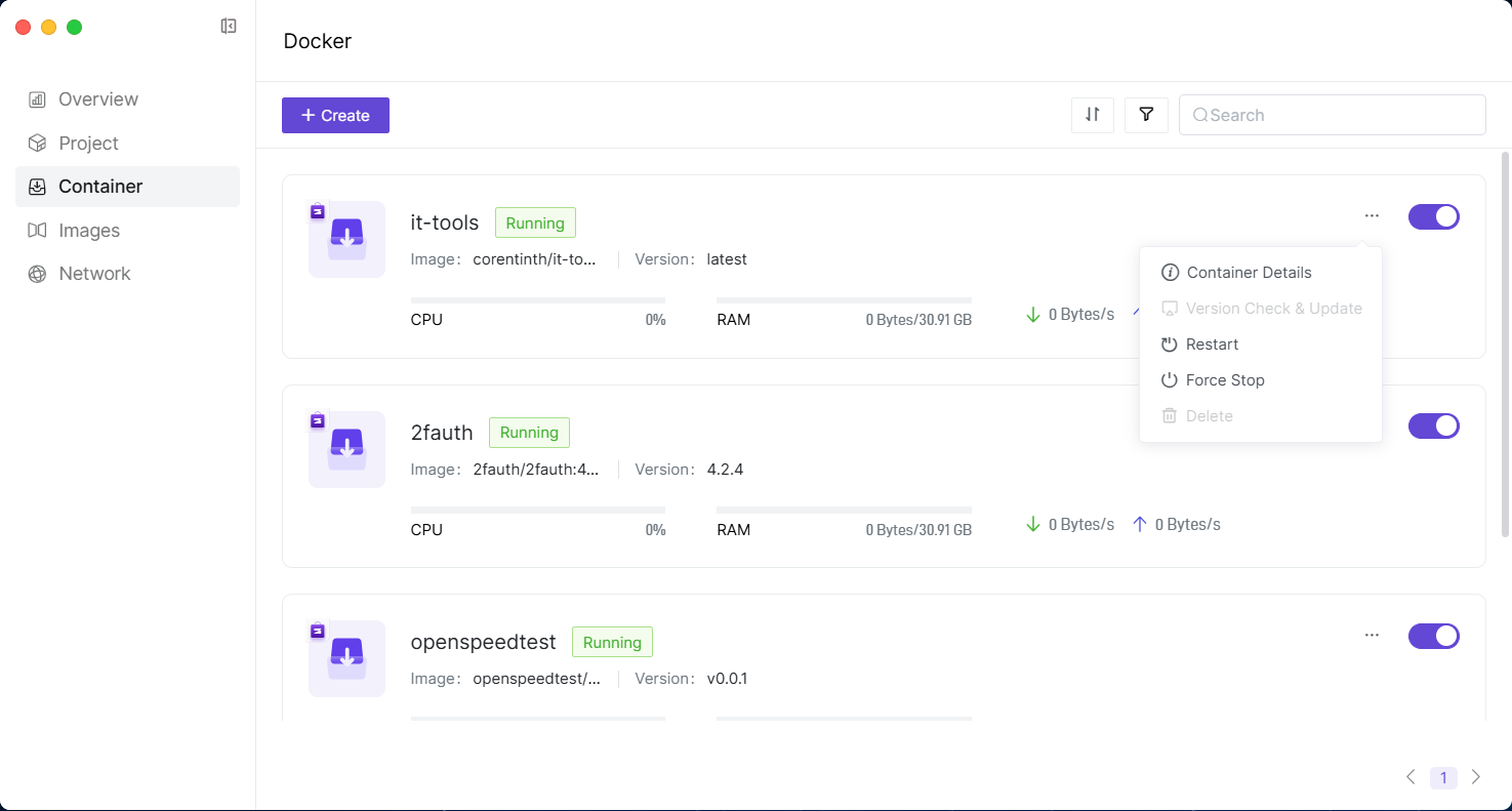 The container interface allows for convenient and quick management of containers, such as container creation, viewing container details, version checking and updating, restarting, stopping, and deleting.