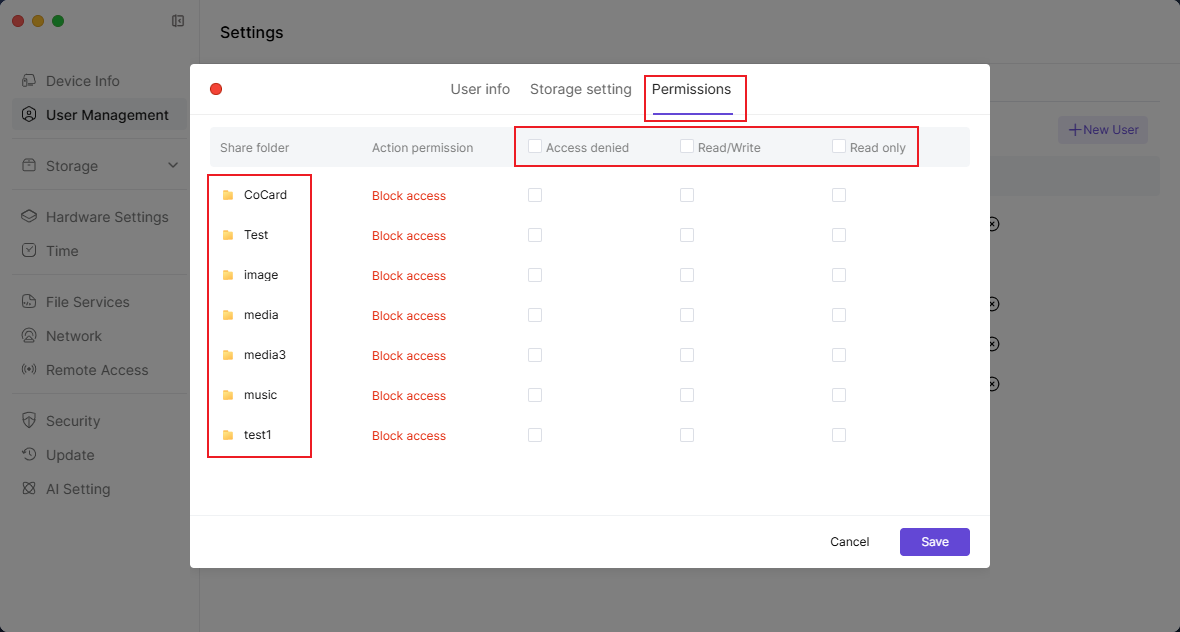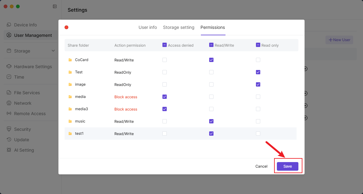 3. Click the【Permissions】button, select the folder, and check the corresponding permissions. The permissions include read and write, read-only, and deny access.