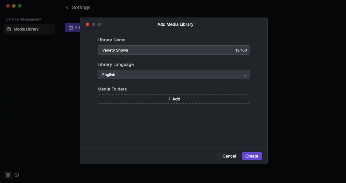 3.Enter the library name in the "Library Name" field (e.g., Variety Shows, TV Series). 4.Click the "Add" button in the "Media Folders" field and select the folder storing your video resources.