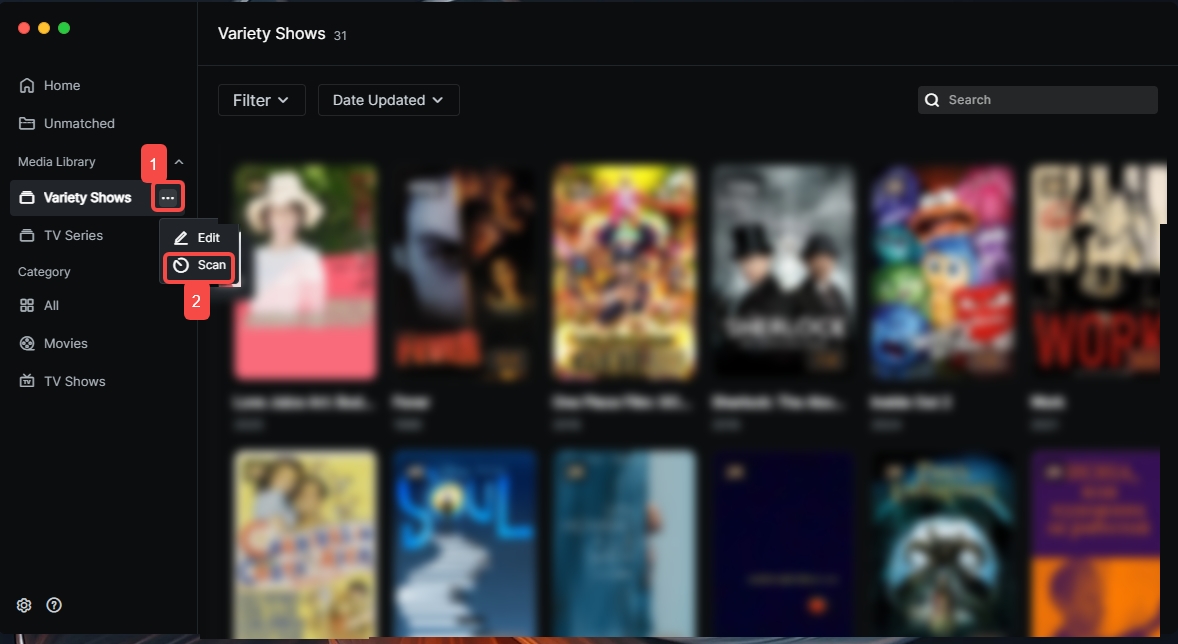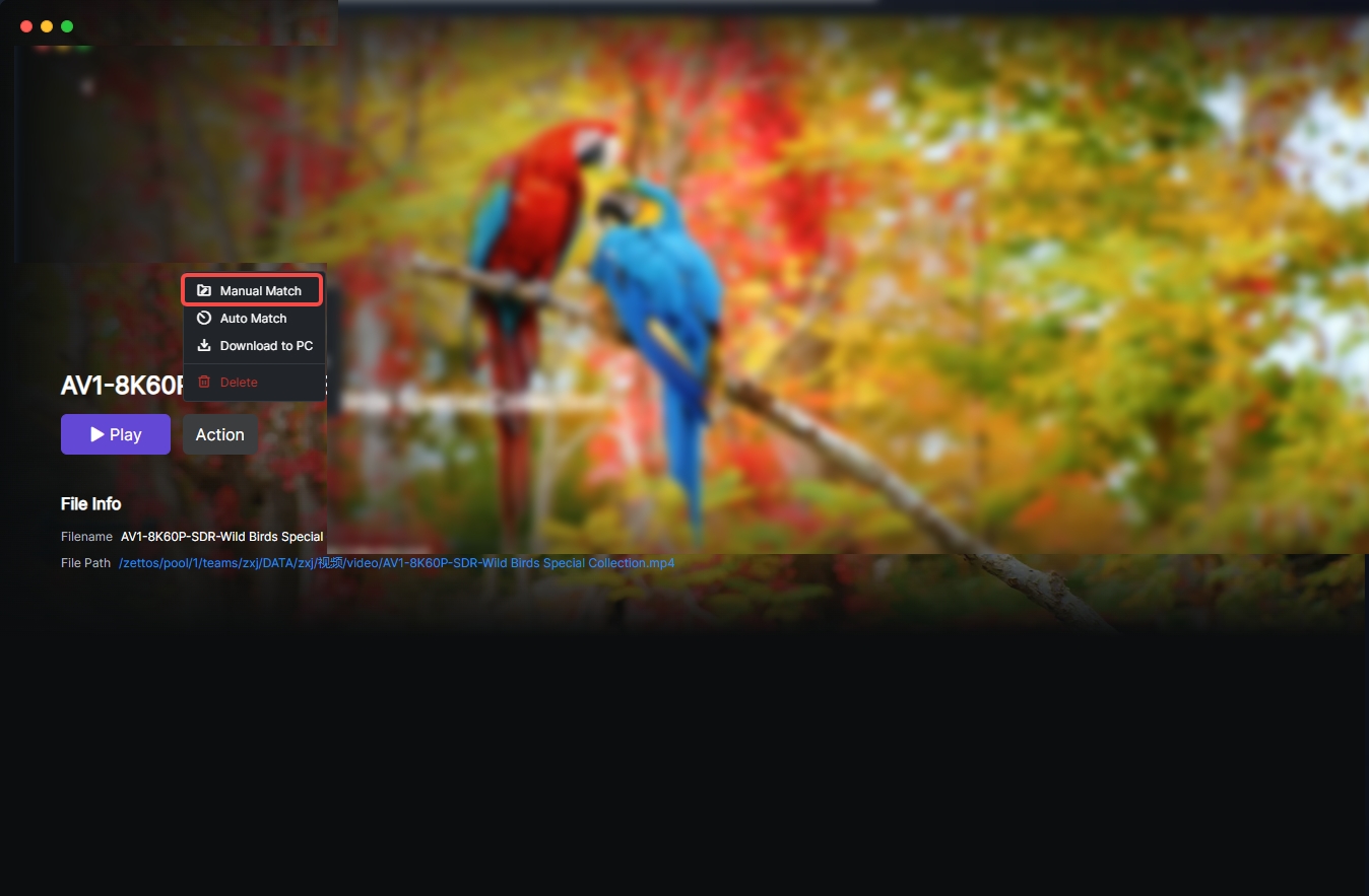 If the matched info is incorrect or unmatched, you can perform "Manual Match" on the detail page or unmatched page. 1.Click the video to enter details or go to the Unmatched tab, select the folder, click "Action" or "...", then click "Manual Match".