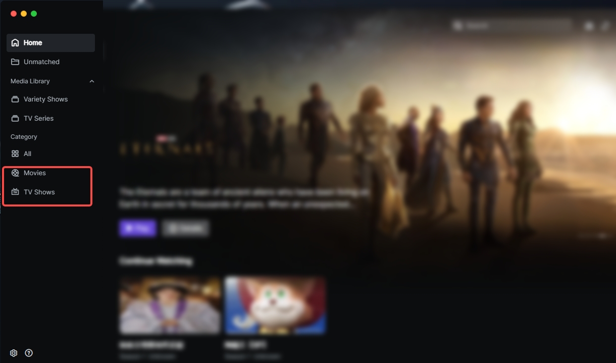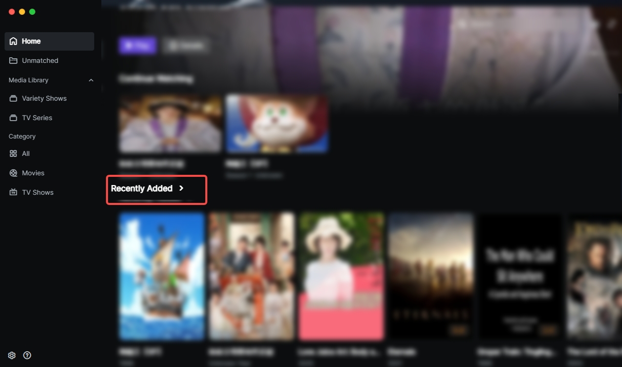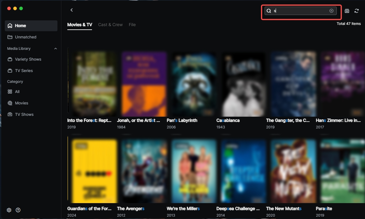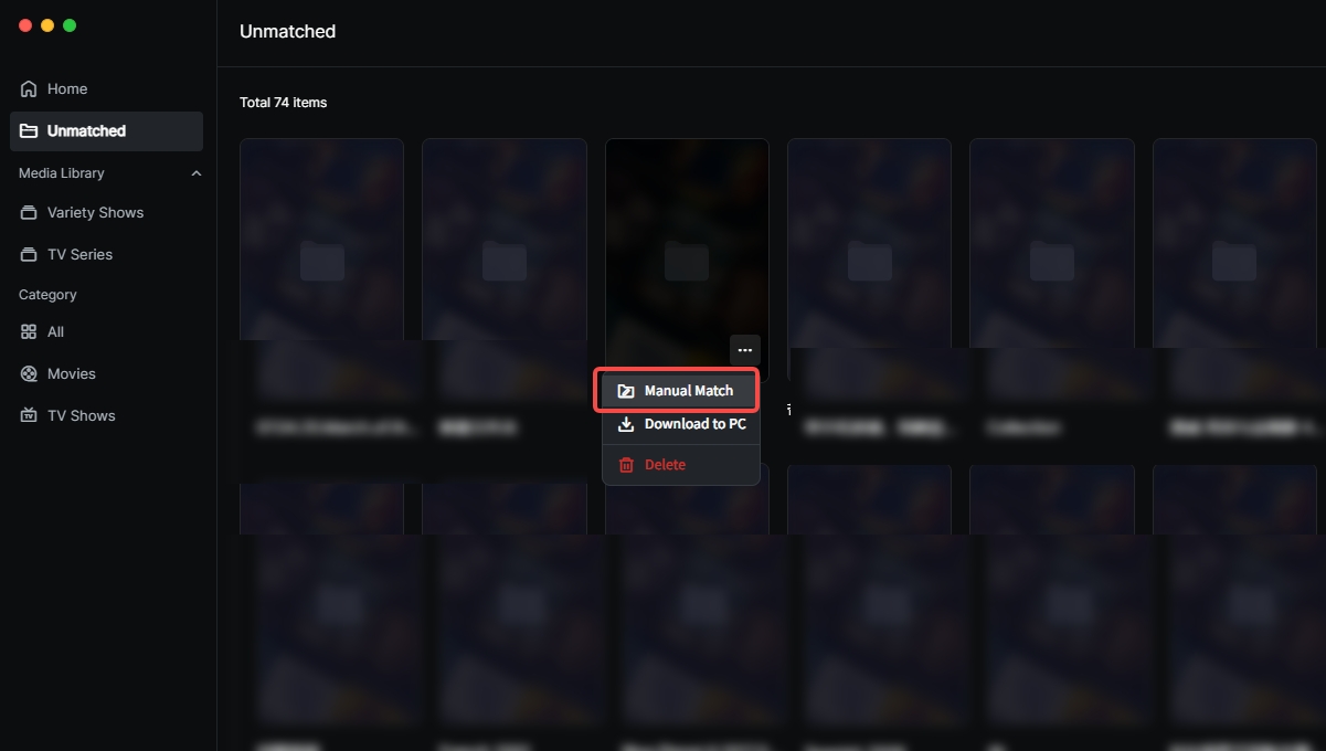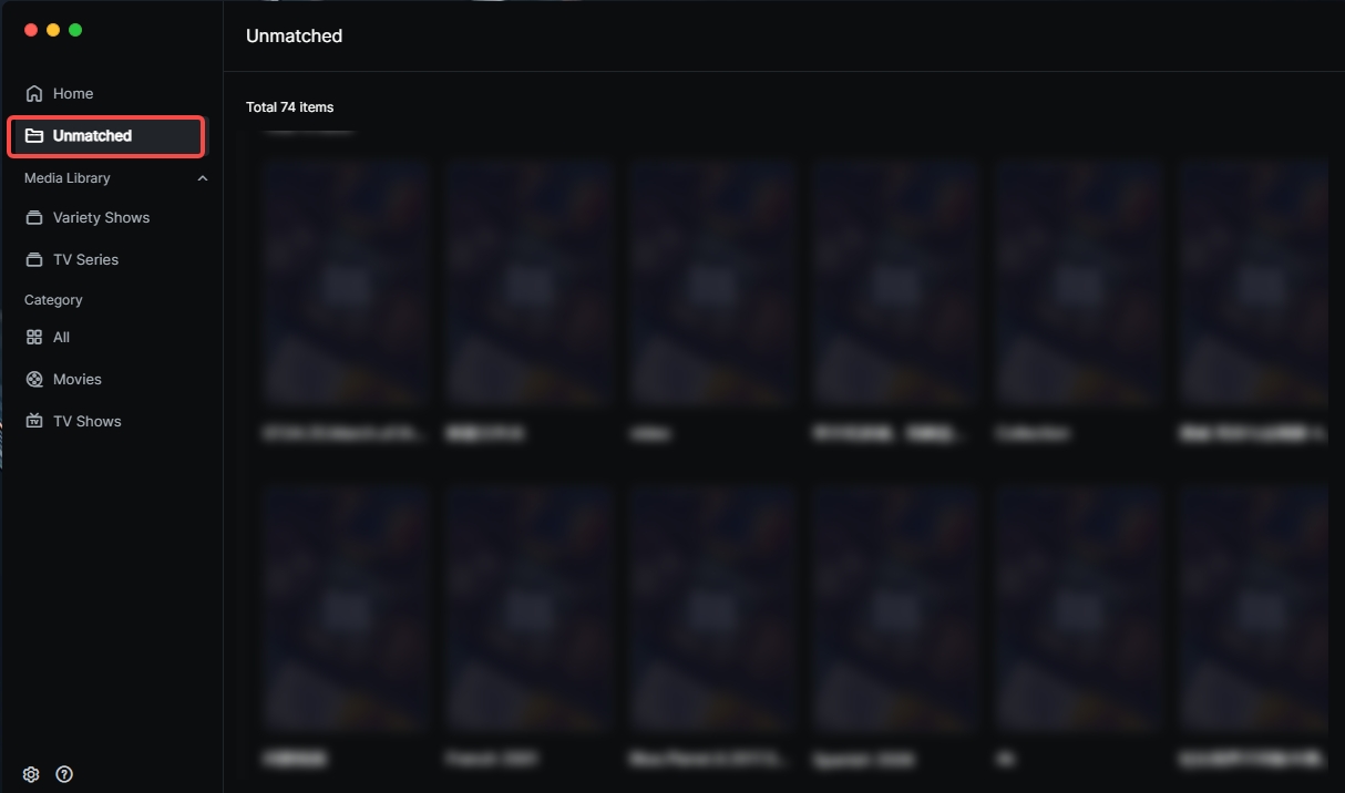 Unmatched:Stores video files that failed automatic identification. Supports manual matching to perfect the poster wall.