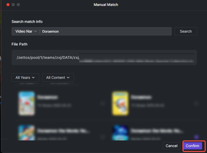 2. Enter the video name and click "Search". Movies: Wait for the list, select the correct movie, click "Confirm".