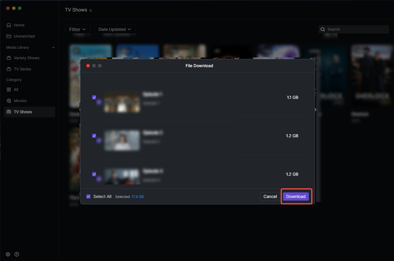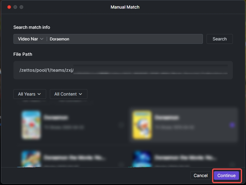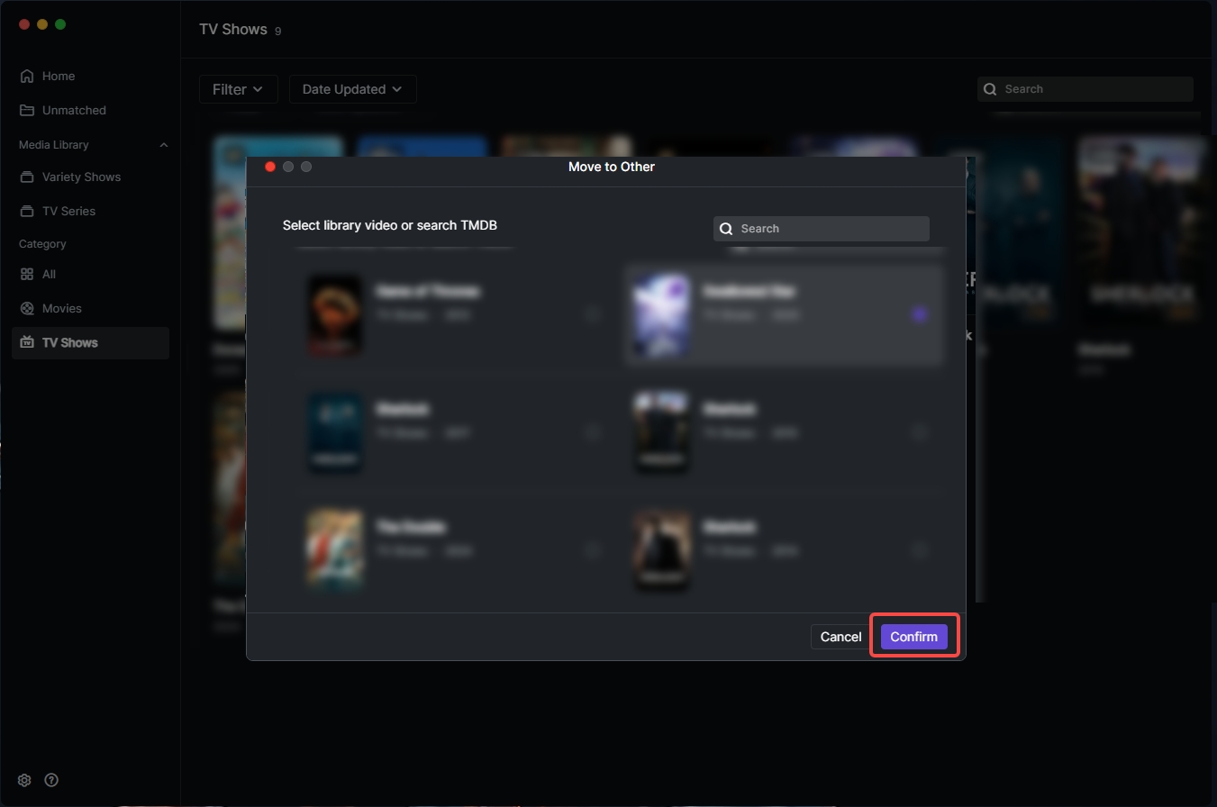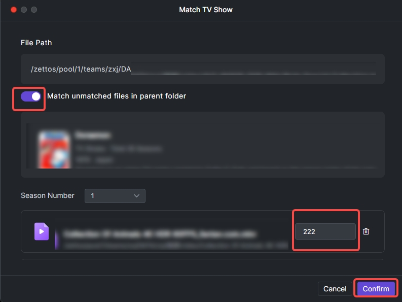 TV Shows: Wait for the list, select the correct show, click "Continue". Supports one-click matching for unmatched files in parent folders and manual modification of episode numbers. Click "Confirm" after modification.