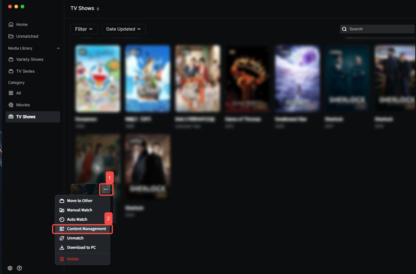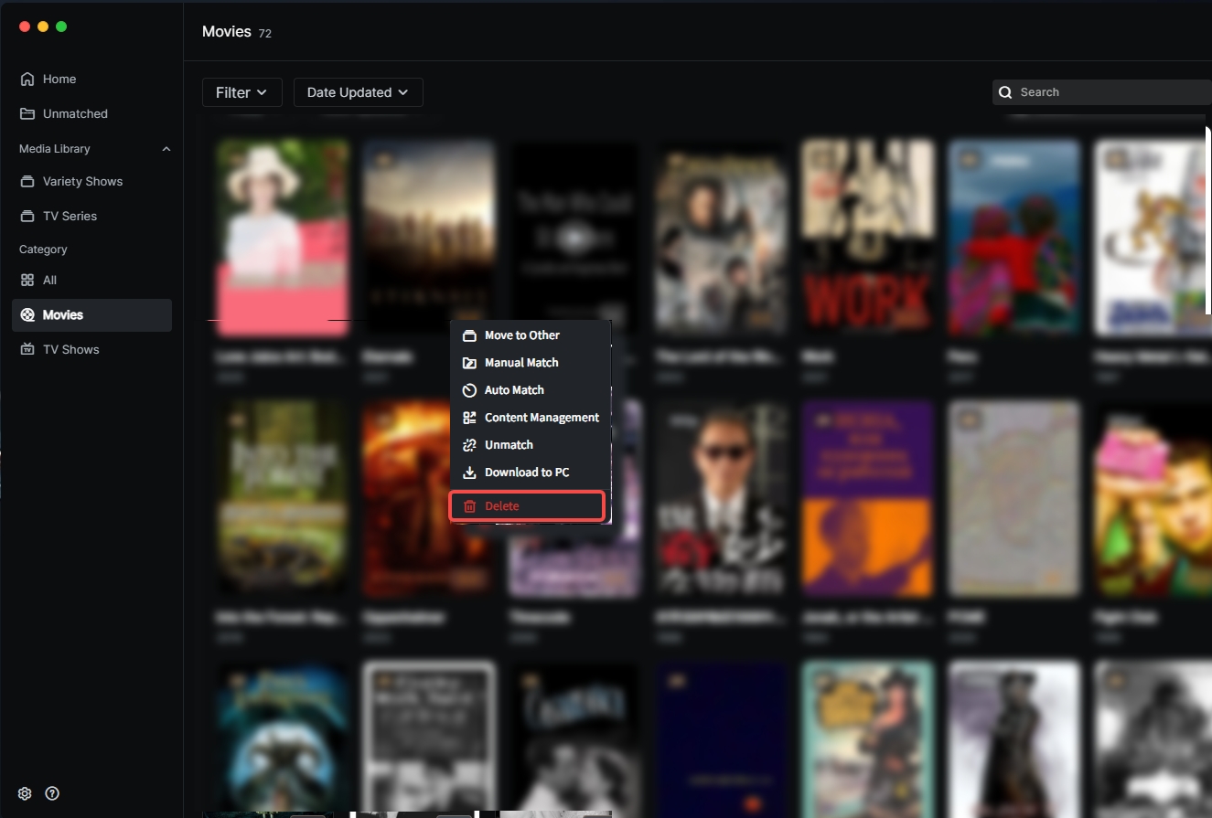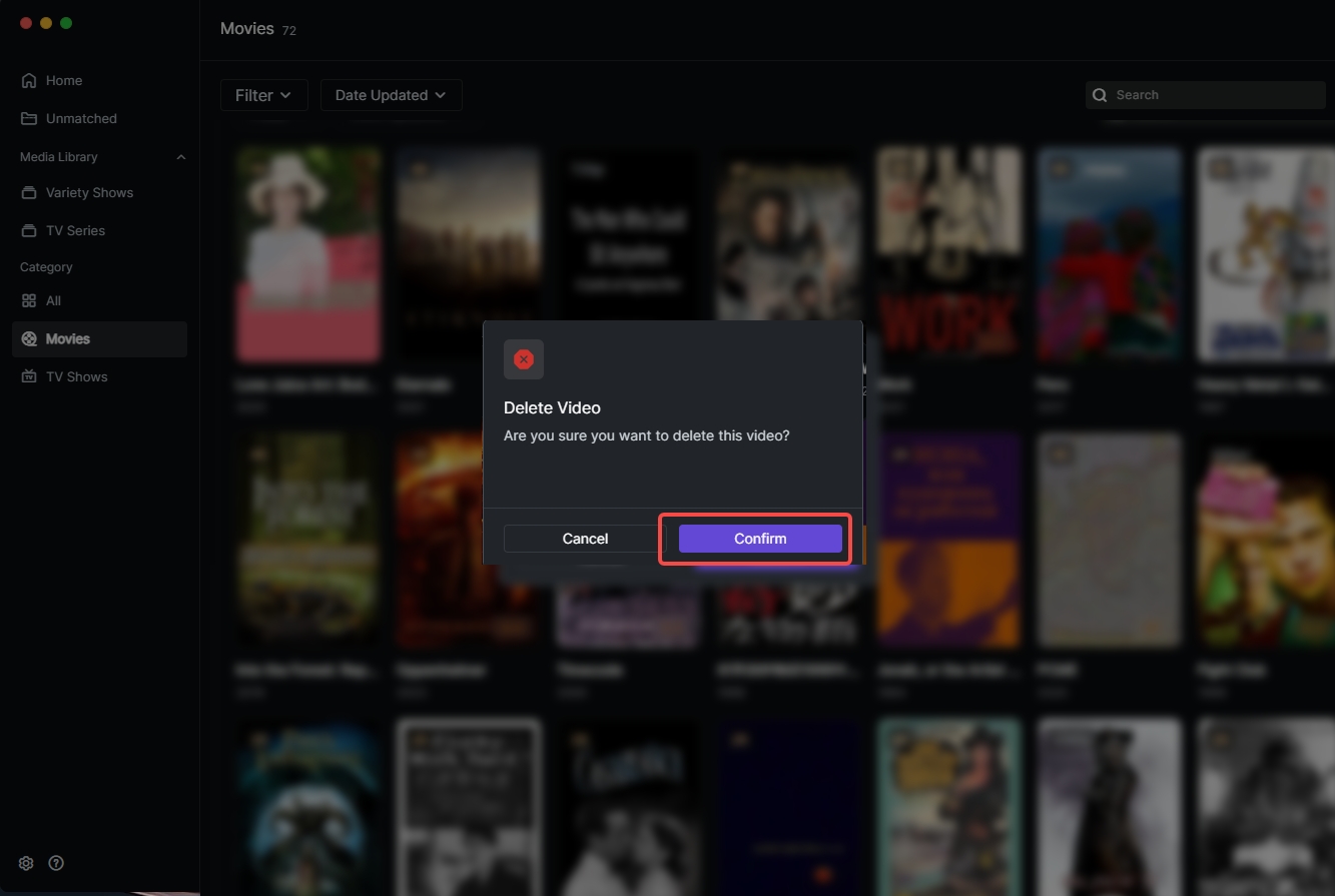1.In "Theater", find the mismatched video file. 2.Hover over the poster, click the "..." button, select "Move to Other".