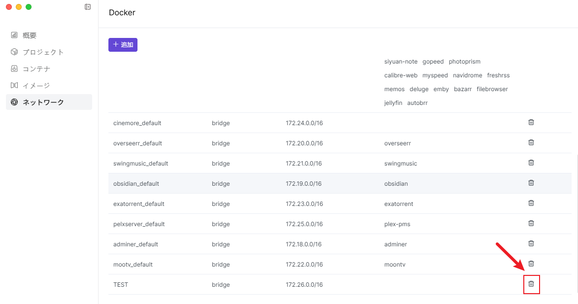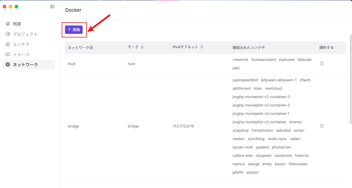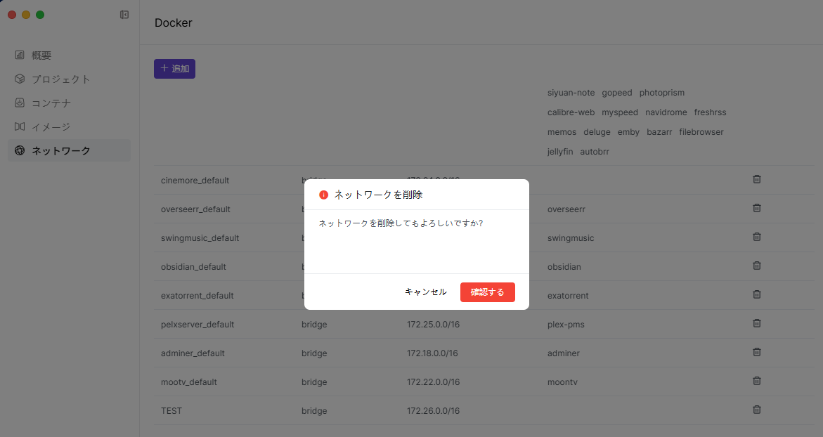 【ネットワーク】画面では、コンテナのネットワーク設定を簡単に表示・管理できます。カスタムネットワークの作成、ネットワーク設定の表示、不要になったネットワークの削除をサポートしています。