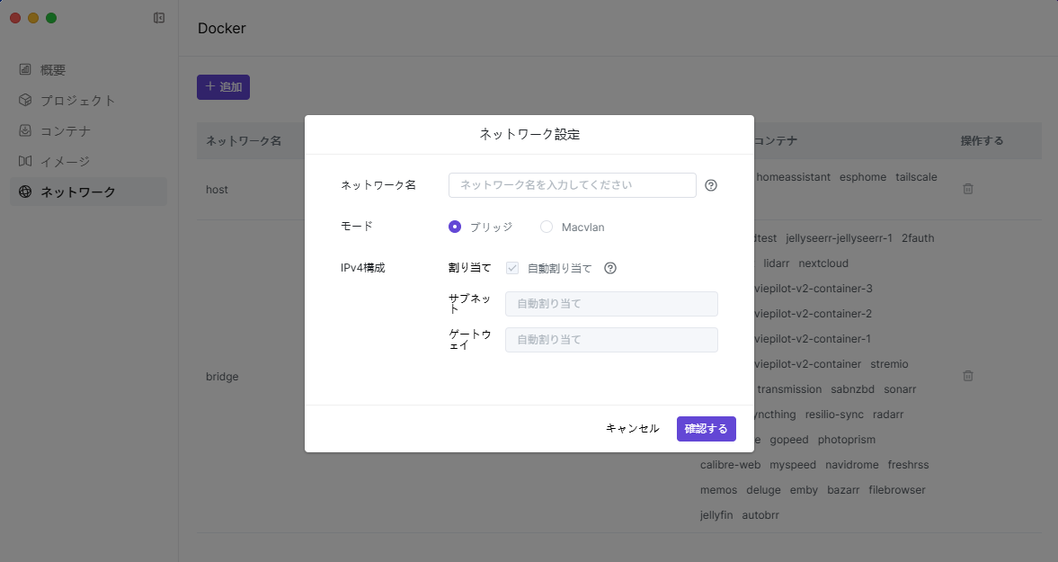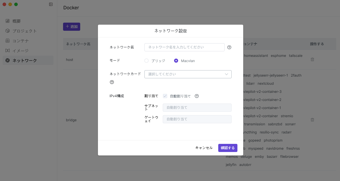 【ネットワーク】画面で、【追加】をクリックし、情報を入力し、モードで【Macvlan】を選択し、ネットワークカードモデルを選択して、【確認】をクリックします。