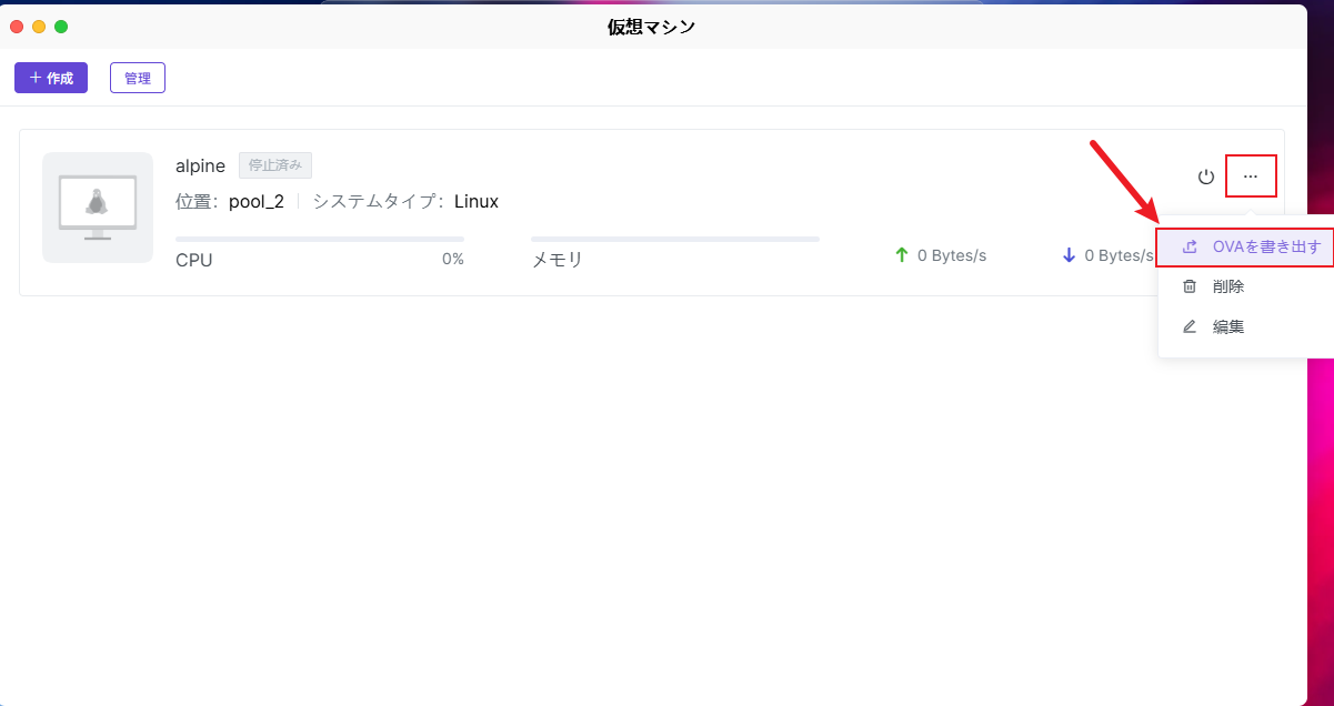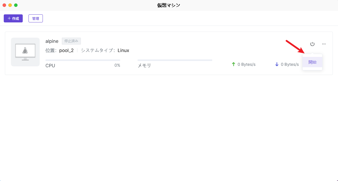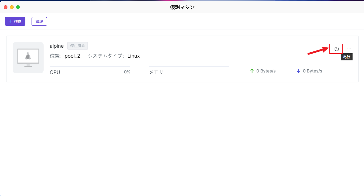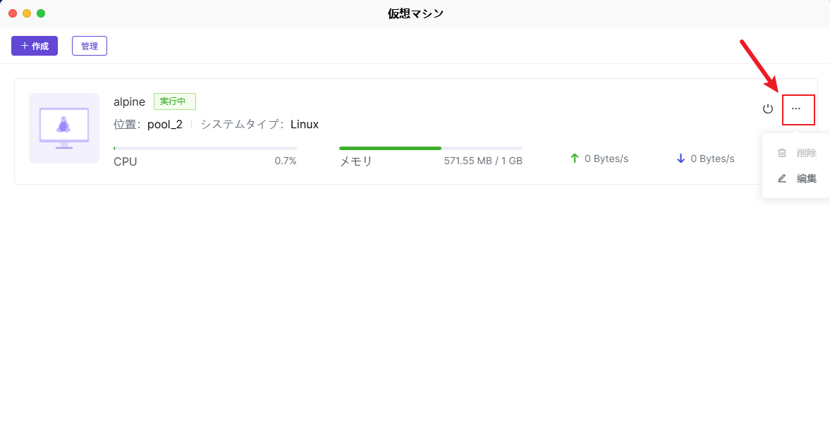 仮想マシンインスタンスの管理:仮想マシンインスタンスを選択すると、電源オン、電源オフ、強制シャットダウンなどの電源制御操作を行うことができます。仮想マシンインスタンスの項目の横にある【···】をクリックすると、仮想マシン設定の変更や仮想マシンの削除など、より多くの管理操作を行うことができます。 管理操作: 仮想マシンアプリの「管理」オプションでは、次の操作を実行できます: