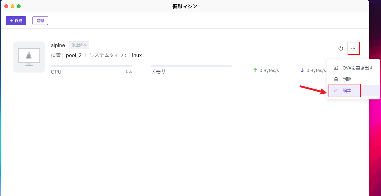 仮想マシンのホームページで【編集】をクリックすると、仮想マシンの基本情報、リソース設定(ディスク、ネットワークなど)、デバイス設定を管理し、必要に応じて仮想マシンのパフォーマンスとリソース割り当てを調整できます。