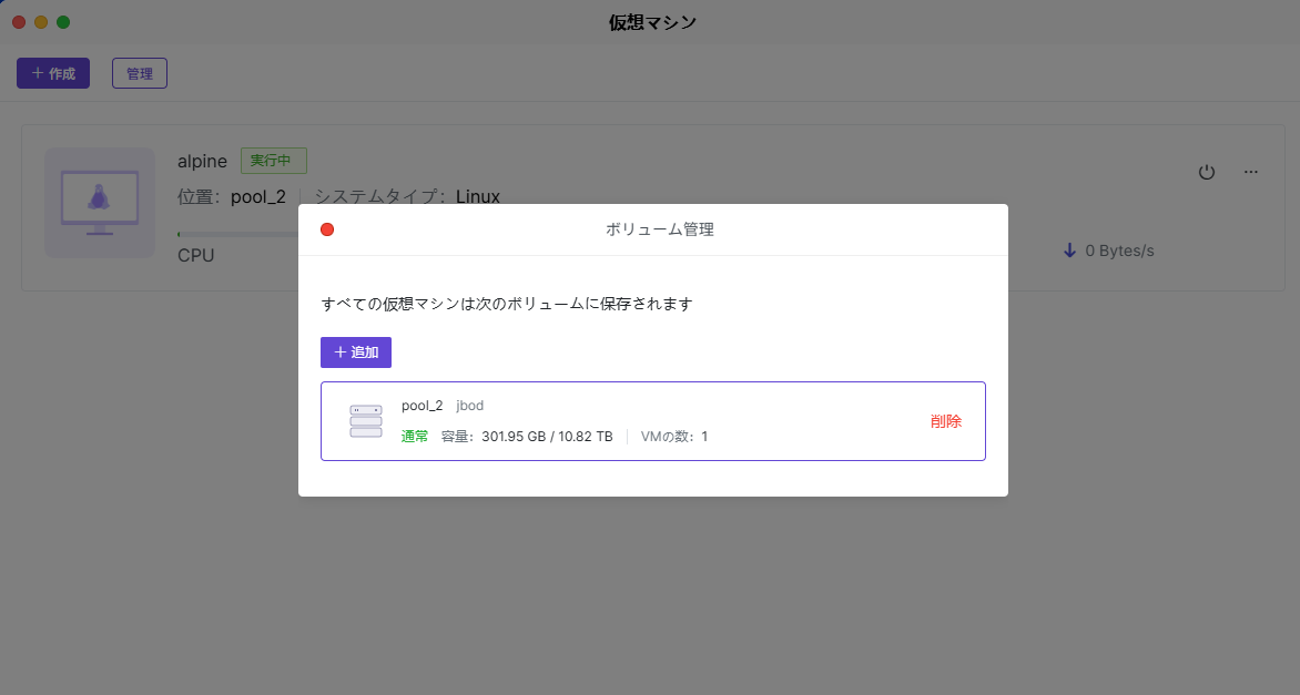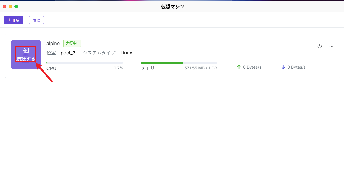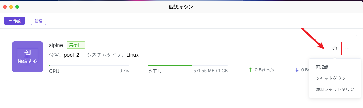 仮想マシンのページでは、作成済みの仮想マシンインスタンスを簡単に管理し、その重要情報を確認し、さまざまな管理操作を実行できます。 仮想マシンインスタンスの閲覧:ホームページでは、現在作成されている仮想マシンインスタンスの詳細情報を確認できます。これには、現在の仮想マシンのデータ保存場所、システムタイプ、仮想マシン名、実行状態などが含まれます。 仮想マシンの起動:仮想マシンのページで作成した仮想マシンインスタンスを見つけ、仮想マシンインスタンス内で【電源オン】をクリックして仮想マシンを起動します。 仮想マシンへのアクセス:仮想マシンインスタンスにアクセスするには、実行中の仮想マシンインスタンスを選択し、【接続する】をクリックします。